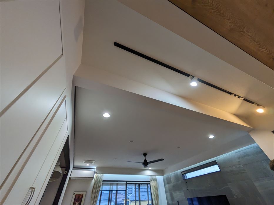 照明や傾斜のある天井形状に合わせ、既存クロスを丁寧に剥がしたうえで下地の確認と補修を行い、新たなクロスを美しく仕上げました。