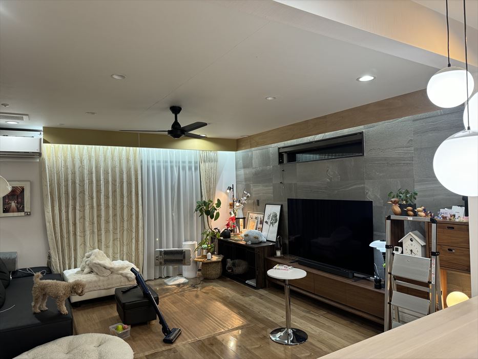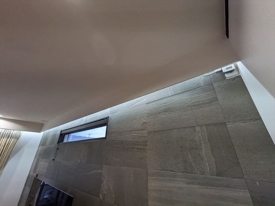 今回は、リビング天井のクロス貼替工事を行いました。